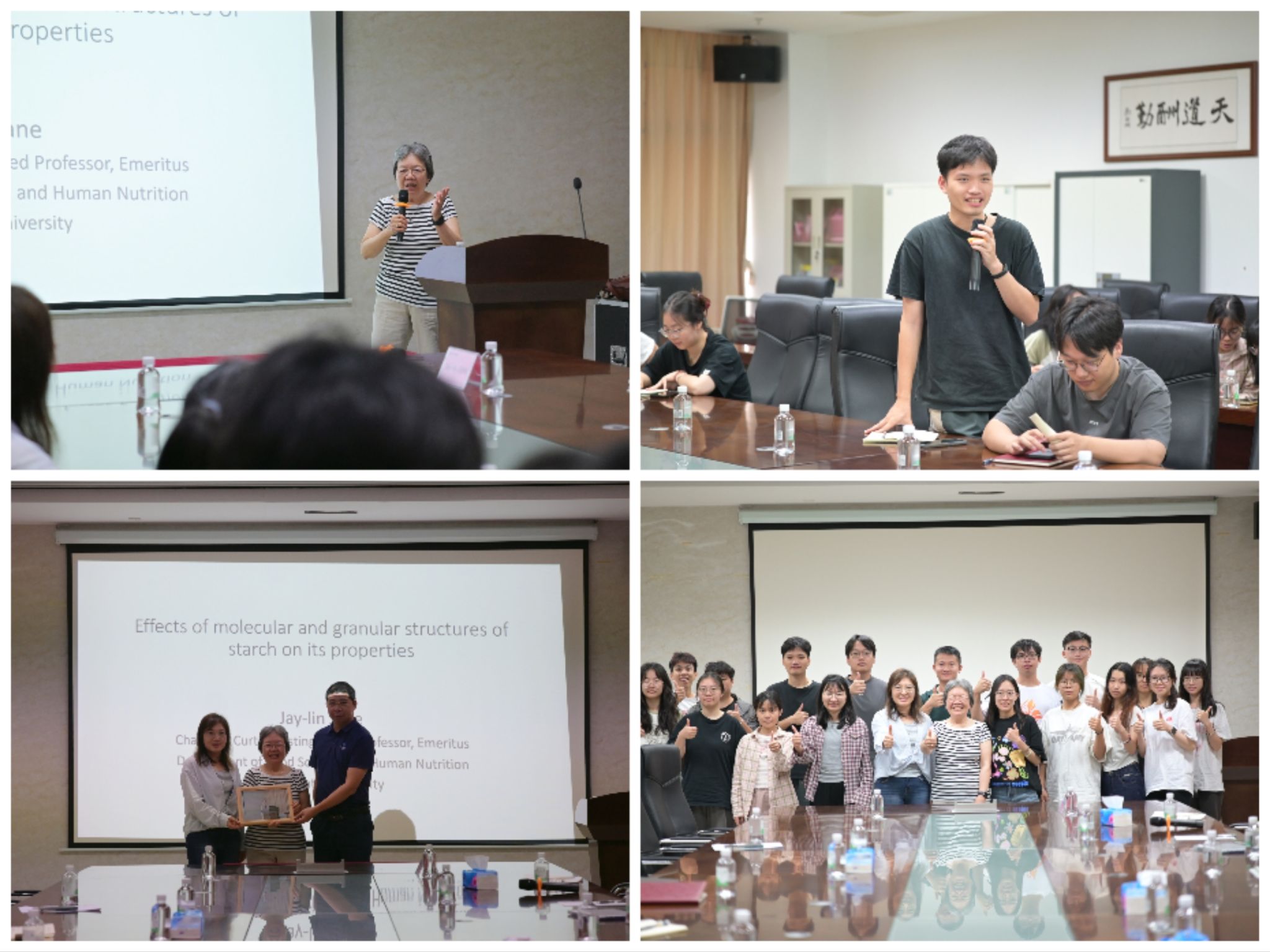 报告会上,Jane教授以《淀粉分子和颗粒结构对性质的影响》为题,系统介绍了淀粉科学的基础和前沿研究进展。报告不仅涵盖了淀粉精细结构、性质表征等基础理论知识,更融入了Jane教授在淀粉改性与应用领域的宝贵经验,为在场师生呈现了一场理论与应用并重的学术盛宴。在互动环节,师生们围绕淀粉的酶解机制优化、交联改性技术创新以及清洁标签淀粉生产工艺等热点问题,与Jane教授展开了深入交流,现场学术氛围浓厚,讨论热烈。报告会后,谢炯标代表吃瓜网站