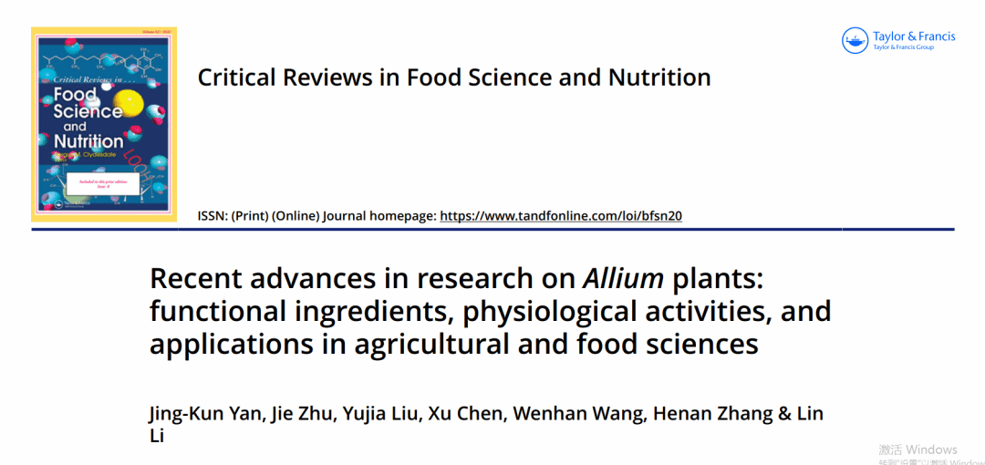 闫景坤教授(第一作者、通讯作者)在国际食品Top期刊《Critical Reviews in Food Science and Nutrition》(IF:11.208, 中科院一区)发表了题为“Recent advances in research on Allium plants: functional ingredients, physiological activities, and applications in agricultural and food sciences”的综述论文。