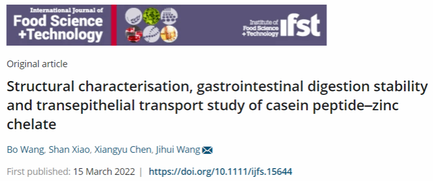 王波博士(第一作者)在国际食品期刊《International Journal of Food Science and Technology》(IF:3.612, 中科院二区)发表了题为“Structural characterisation, gastrointestinal digestion stability and transepithe-lial transport study of casein peptide–zinc chelate”的研究论文。