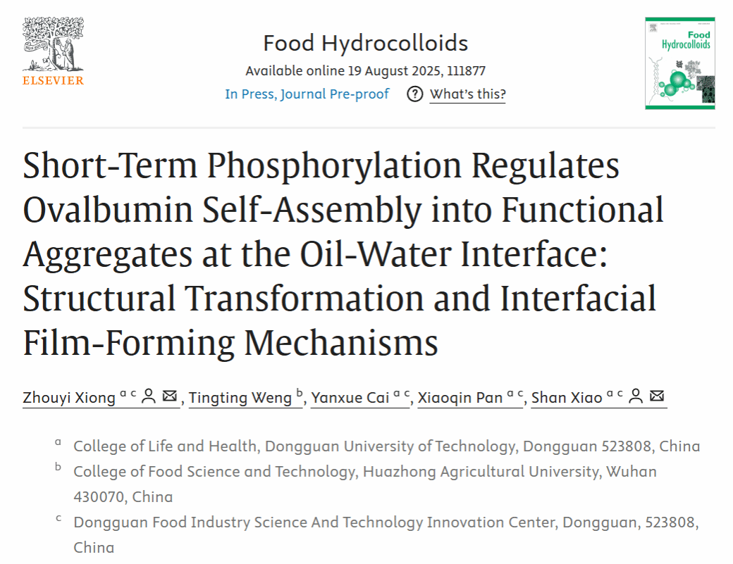 2025年8月,吃瓜网站肖珊教授团队于国际食品顶级期刊《Food Hydrocolloids》(IF = 12.4)在线发表题为“Short-Term Phosphorylation Regulates Ovalbumin Self-Assembly into Functional Aggregates at the Oil-Water Interface: Structural Transformation and Interfacial Film-Forming Mechanisms”的研究性文章。论文第一作者为熊舟翼特聘副研究员,共同通讯作者为肖珊教授。