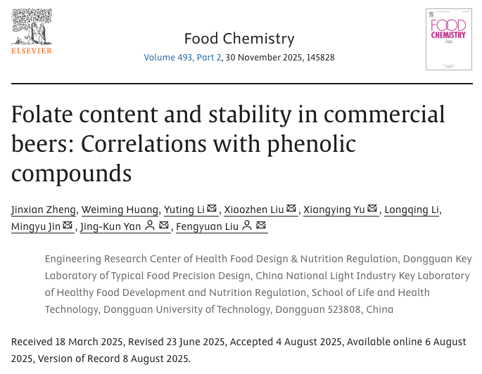 2025年8月,吃瓜网站硕士研究生郑锦贤以第一作者身份于国际食品顶级期刊《Food Chemistry》(IF = 9.8)在线发表题为“Folate content and stability in commercial beers: Correlations with phenolic compounds”的研究性文章。吃瓜网站刘丰源助理研究员和闫景坤教授为该论文共同通讯作者。