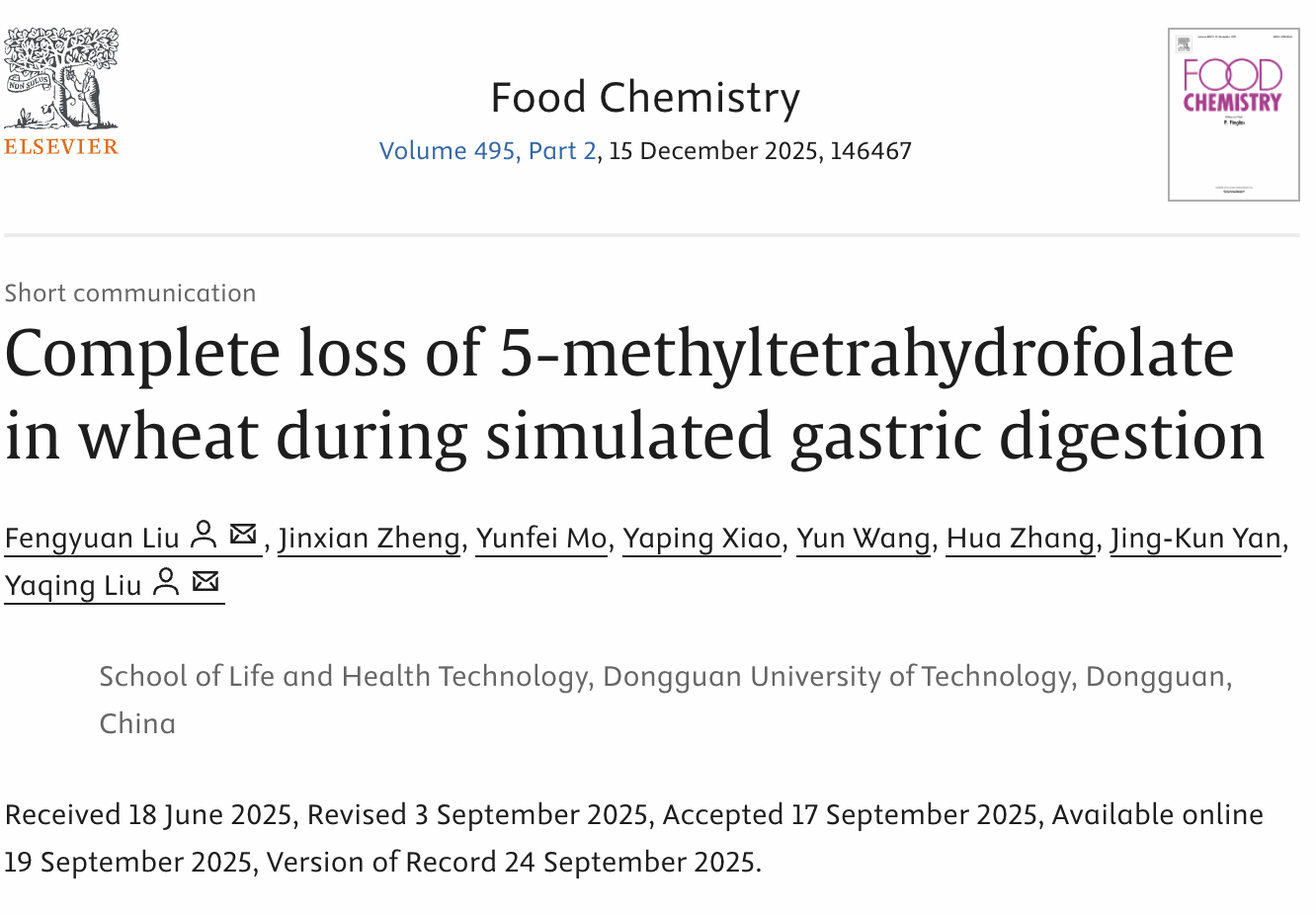 2025年9月,吃瓜网站刘亚青教授团队于国际食品顶级期刊《Food Chemistry》(IF = 9.8)在线发表题为“Complete loss of 5-methyltetrahydrofolate in wheat during simulated gastric digestion”的快报研究性文章。吃瓜网站刘丰源助理研究员为第一作者和通讯作者,刘亚青教授为该论文共同通讯作者。