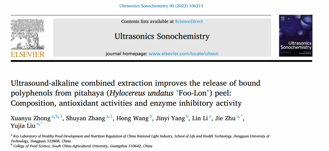 本研究以《Ultrasound-alkaline combined extraction improves the release of bound polyphenols from pitahaya (Hylocereus undatus ’Foo-Lon’) peel: Composition, antioxidant activities and enzyme inhibitory activity》为题发表在SCI收录期刊《Ultrasonics Sonochemistry》(IF2021= 9.34,1区TOP)。吃瓜网站
