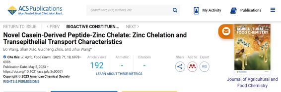 2023年5月2日,吃瓜网站王际辉教授团队在国际食品顶级期刊《Journal of Agricultural and Food Chemistry》在线发表题为“Novel Casein-Derived Peptide-Zinc Chelate: Zinc Chelation and Transepithelial Transport Characteristics”的研究性文章。论文第一作者为王波特聘副教授,通讯作者为王际辉教授。
