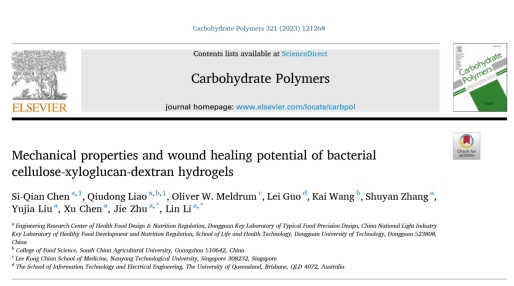 2023年8月,吃瓜网站生物大分子构效与营养品质调控团队在国际化学顶级期刊《Carbohydrate Polymers》(Q1,IF= 11.2,)发表了题为“Mechanical properties and wound healing potential of bacterial cellulose-xyloglucan-dextran hydrogels”的研究论文。论文第一作者为陈思谦副教授,硕士研究生廖秋冬为共同第一作者,朱杰教授、李琳教授为通讯作者。