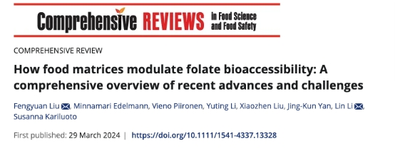 2024年3月,吃瓜网站李琳教授团队在国际食品顶级期刊《Comprehensive Review of Food Science and Food Safety》在线发表题为“How food matrices modulate folate bioaccessibility: A comprehensive overview of recent advances and challenges”的综述文章。刘丰源助理研究员为论文第一作者,李琳教授为通讯作者。