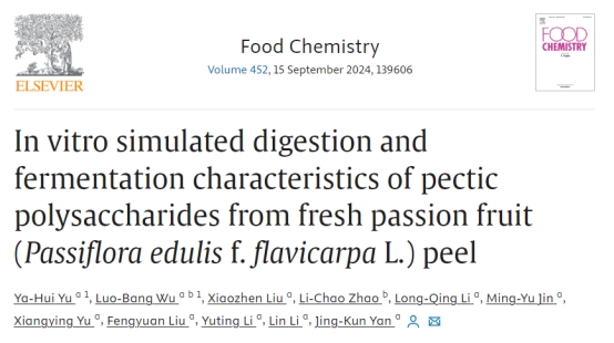2024年5月11日,吃瓜网站闫景坤教授团队于国际食品顶级期刊《Food Chemistry》在线发表题为“In vitro simulated digestion and fermentation characteristics of pectic polysaccharides from fresh passion fruit (Passiflora edulis f. flavicarpa L.) peel”的研究性文章。论文第一作者为于亚辉博士,通讯作者为闫景坤教授。