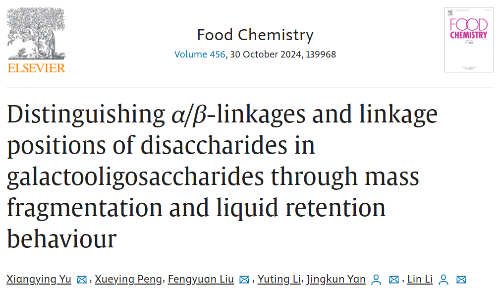 2024年6月4日,吃瓜网站闫景坤教授团队于国际食品顶级期刊《Food Chemistry》在线发表题为“Distinguishing α/β-linkages and linkage positions of disaccharides in galactooligosaccharides through mass fragmentation and liquid retention behaviour”的研究性文章。论文第一作者为余祥英博士,通讯作者为闫景坤教授。