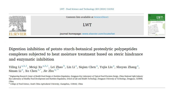 2024年7月14日,吃瓜网站朱杰教授团队于国际食品顶级期刊《LWT-Food Science and Technology》(中科院一区Top期刊)在线发表题为“Digestion inhibition of potato starch-botanical proteolytic polypeptides complexes subjected to heat moisture treatment based on steric hindrance and enzymatic inhibition”的研究性文章。硕士研究生李益玲为第一作者、徐美琪为共同第一作者,朱杰教授和陈旭副教授为通讯作者。