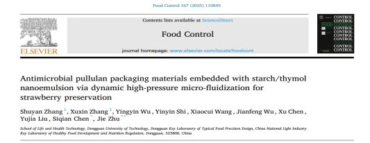 2024年8月31日,吃瓜网站朱杰教授团队于国际食品顶级期刊《Food Control》(中科院一区Top期刊)在线发表题为“Antimicrobial pullulan packaging materials embedded with starch/thymol nanoemulsion via dynamic high-pressure micro-fluidization for strawberry preservation”的研究性文章。张书艳实验员为第一作者,硕士研究生张旭鑫为共同第一作者,朱杰教授为通讯作者。