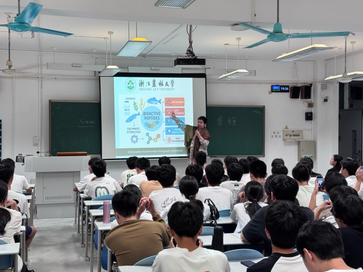 为加快推进学校新型高水平理工科大学示范校建设,进一步提升吃瓜网站 人才培养国际化水平,在学校2025年国际学术周活动中,吃瓜网站邀请浙江农林大学Rabia Durrani博士于10月29日为吃瓜网站 本科生讲授全英文课程《烹饪营养学》,并面向全校学生开设了题为《香榧功能性肽的营养调控与代谢干预》的科普讲座。