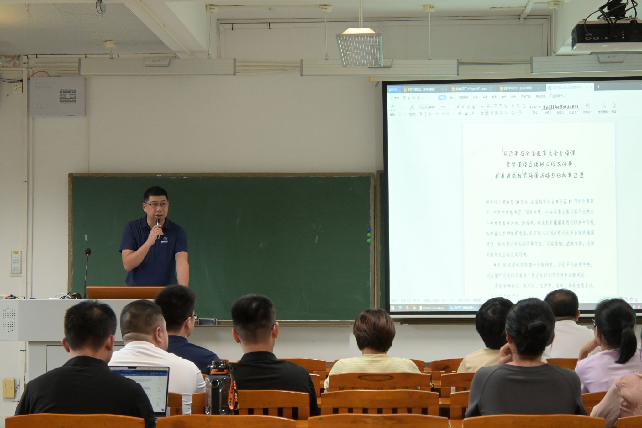 党委书记谢炯标首先带领全体教职工共同学习了习近平总书记在全国教育大会上的重要讲话精神,并强调了师德师风建设在教育工作中的重要性。他指出,全院教职工应大力弘扬教育家精神,牢记为党育人、为国育才的初心使命,紧紧围绕立德树人根本任务,落实好师德师风第一标准,争做“四有”好老师,努力成为“大先生”,以身作则树立良好师德形象,始终坚持用党的创新理论铸魂育人。他要求,全院教职工主动关注学生学习生活,加强师生互动,及时了解学生的需求和困难,从而提供更有针对性的帮助和支持,为培养高素质应用型创新人才作出更大贡献。